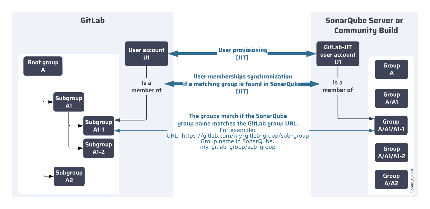 - If a matching group is found in SonarQube Server, the GitLab account's memberships in that group are synchronized in SonarQube Server. The groups match if the SonarQube Server group name matches the GitLab group URL. For example, the SonarQube Server group