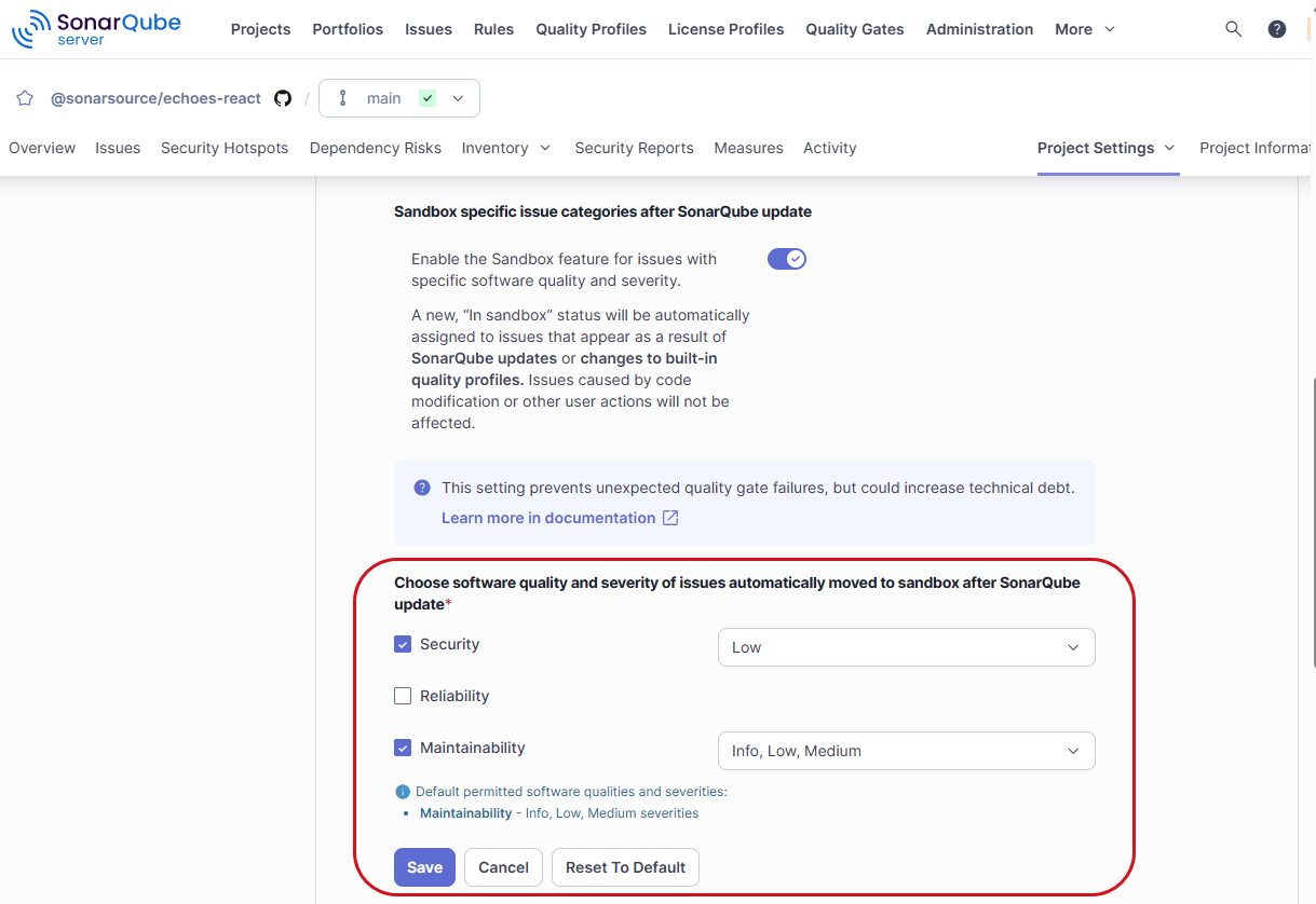 In Choose software quality and severity of issues automatically moved to sandbox after SonarQube update, change the software quality(ies) and/or severity(ies).
