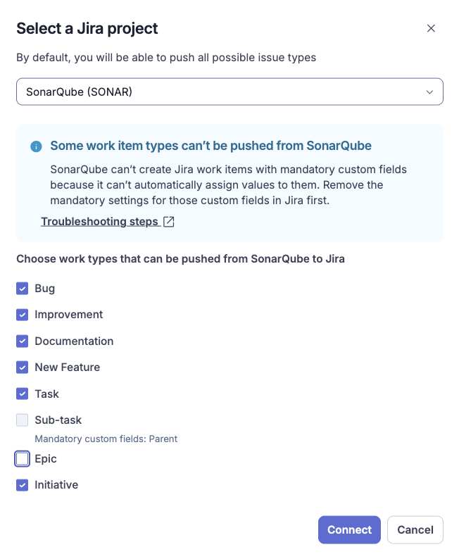 **Solution**: Jira work types that have other mandatory fields associated with them are not supported and are disabled in SonarQube. You can either remove these mandatory fields in Jira or choose a supported work type in SonarQube.